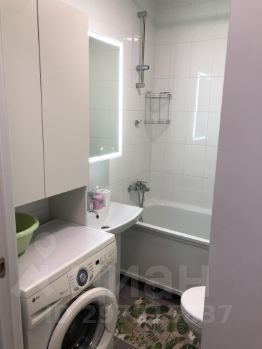 В ванной, подключенная стиральная машина. Сама ванная полноценного размера для взрослого человека.