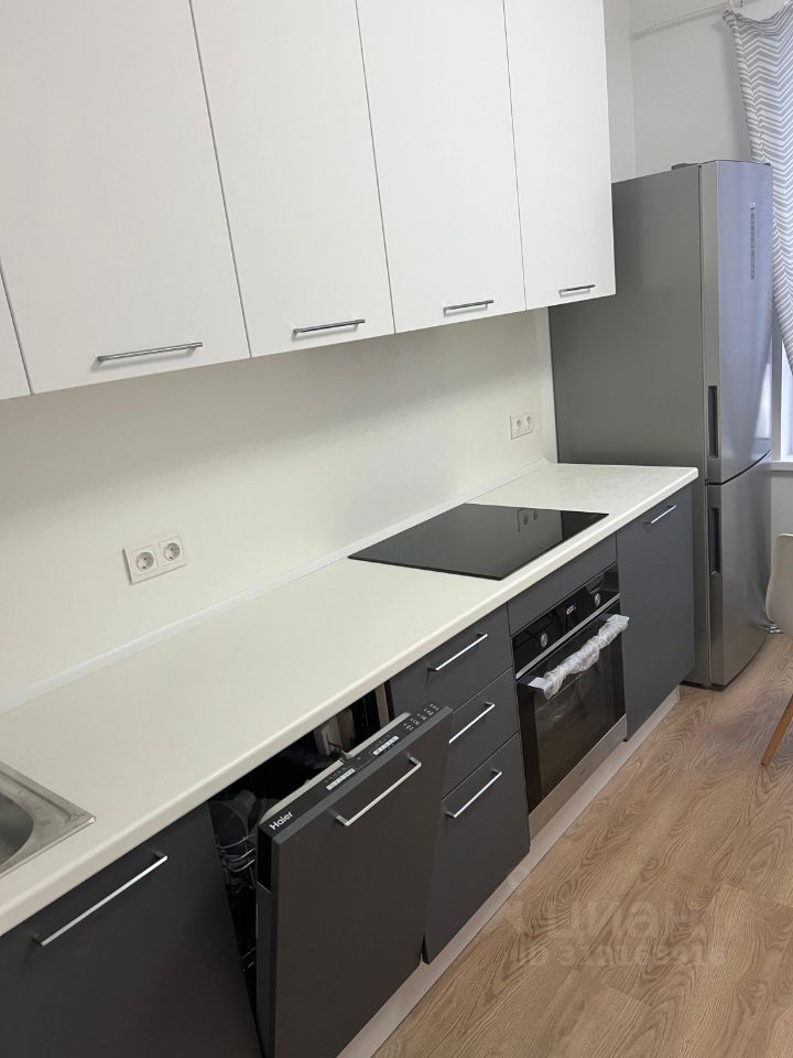 В квартире есть всё необходимое для комфортного проживания: современная мебель на кухне и в комнате, а также вся необходимая техника — холодильник, посудомоечная и стиральная машины. Санузел совмещённый, оборудован ванной.