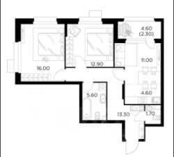 Общая площадь составляет 67 кв. м, комнаты — 16 и 12,9 кв. м, кухня-гостинная — 15,6 кв. м. Два санузла. Квартира расположена на 13 этаже 17-этажного монолитного дома с вентилируемыми фасадами, построенного в конце 2023 года. Высота потолков — 2.8 метра. Окна выходят на две стороны дома - три окна на северную сторону и одно окно на западную сторону.