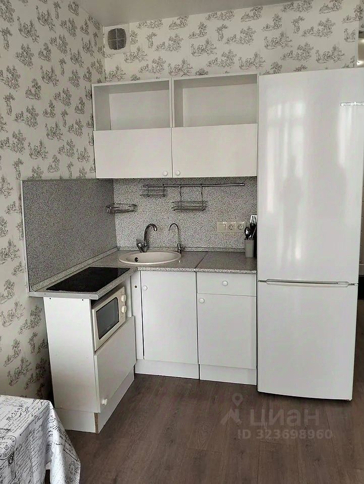Кухонная зона: кухонный гарнитур, варочная панель, микроволновка, холодильник.
