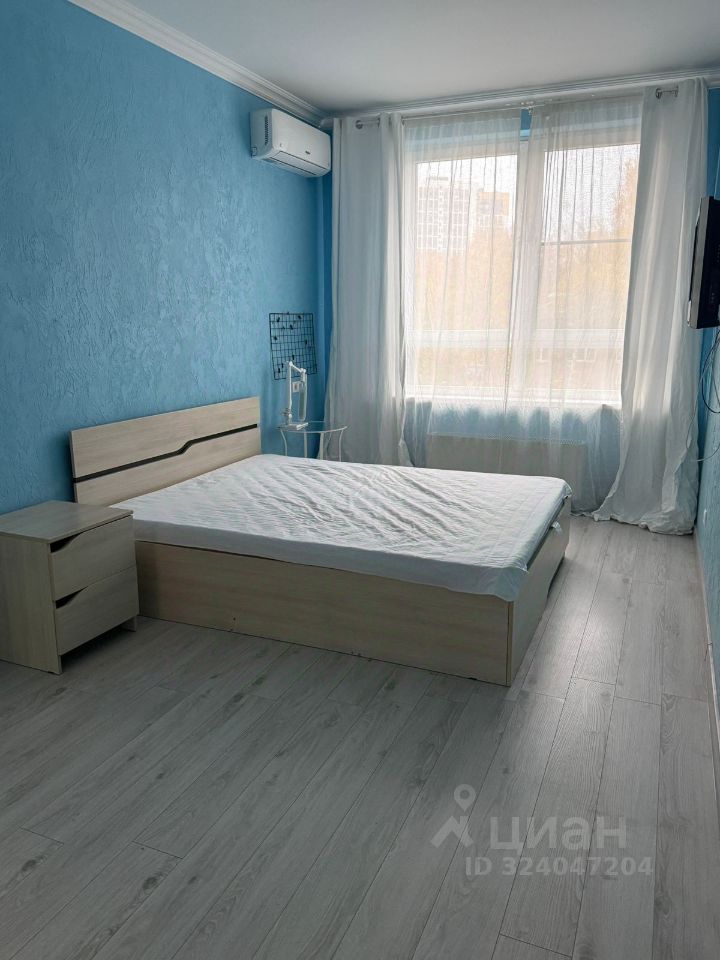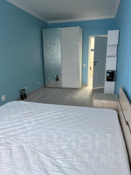 В комнате стоит двуспальная кровать с матрасом, большой шкаф-купе, тумбочки, книжные полки. Есть место для рабочего стола или дополнительной мебели.