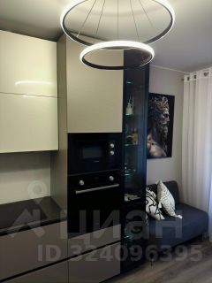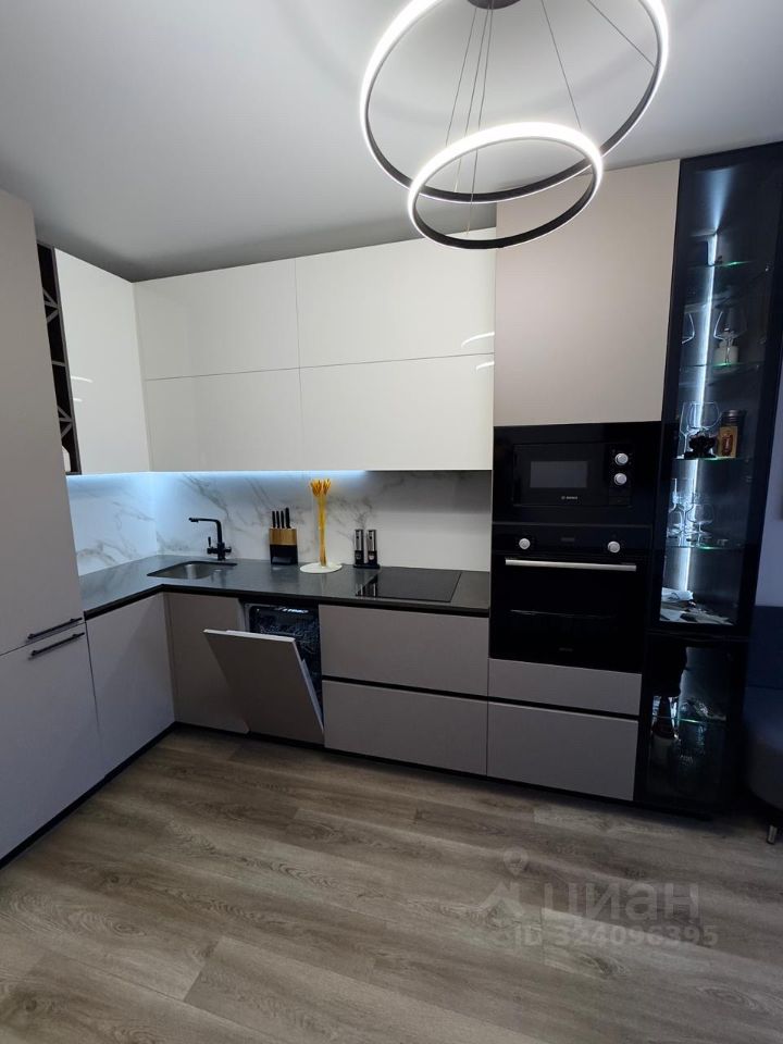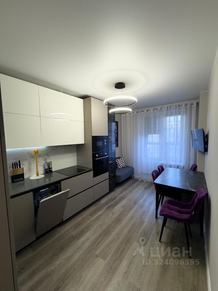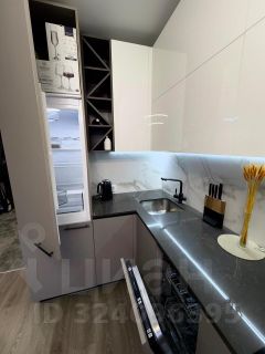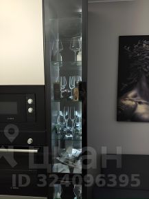 - Дизайнерская кухня: встроенная техника (посудомоечная машина, духовой шкаф, варочная панель, холодильник, свч) стол, 4 стула, телевизор, мини-диван, открытый стеклянный шкаф с подсветкой для хранения посуды, открытые полки для хранения алкогольных напитков.