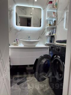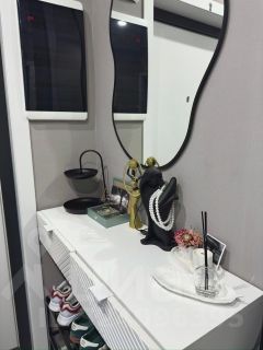 - Ванная комната: подвесная тумба с двумя отсеками, настенная полка, зеркало с подсветкой настенное, стиральная машина, ванная.