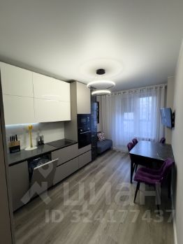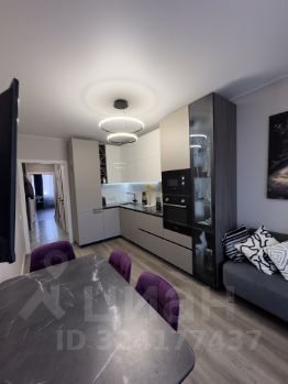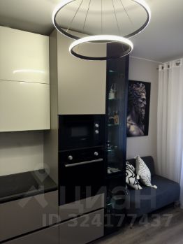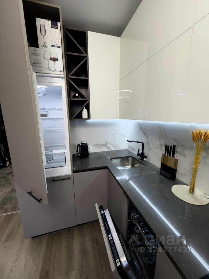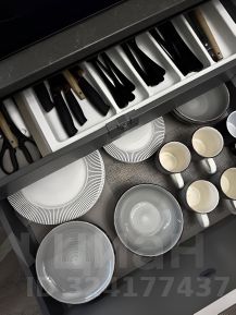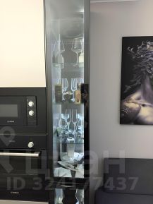 - Дизайнерская кухня: встроенная техника (посудомоечная машина, духовой шкаф, варочная панель, холодильник, свч) стол, 4 стула, телевизор, мини-диван, открытый стеклянный шкаф с подсветкой для хранения посуды, открытые полки для хранения алкогольных напитков.