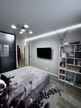 - В спальне 1: 2-х спальная кровать шириной 160см с местом для хранения, настенный плазменный телевизор, гардеробная, комод с 4 секциями, открытый шкаф (на фото занят книгами, при заселении освободится).