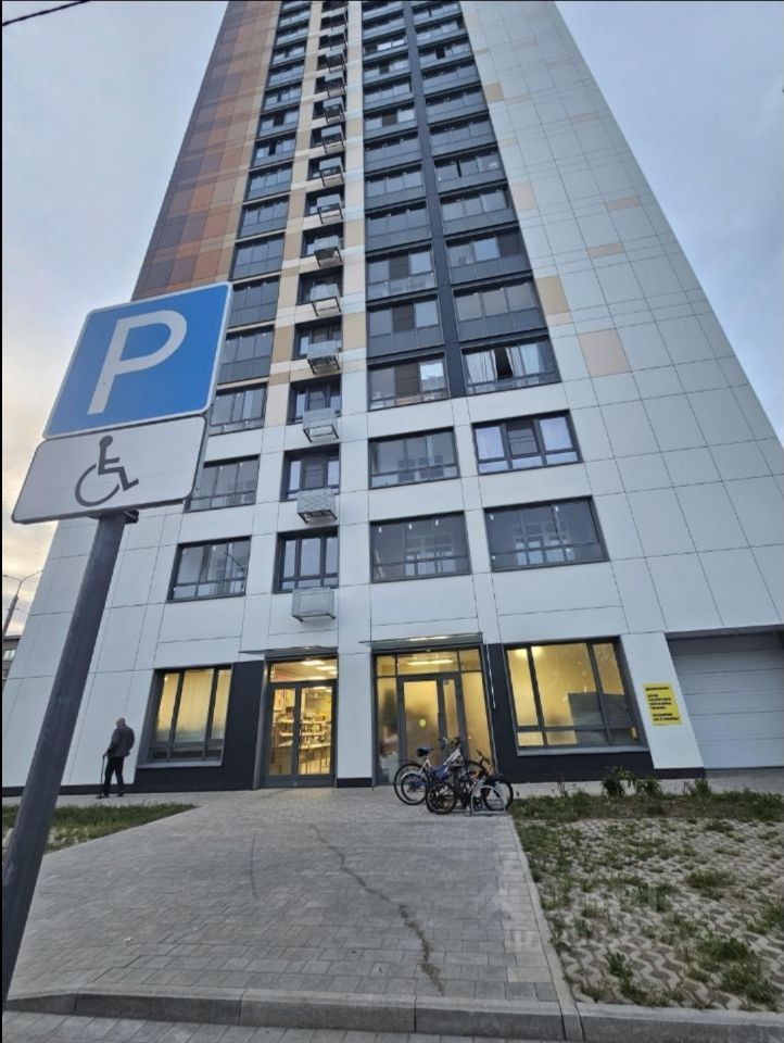 Сдаётся уютная однокомнатная квартира с дизайнерским ремонтом в современном доме 2023 года постройки. Общая площадь квартиры составляет 34,5 кв. м, жилая площадь — 12 кв. м, кухня — 10 кв. м. Квартира расположена на 21 этаже 25-этажного дома, из окон открывается вид на тихий двор. Высота потолков — 2,8 метра.
