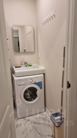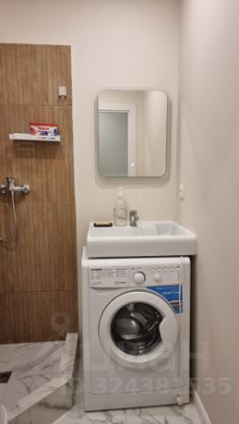 В апартаменте собственный сан. узел в плитке, установлена сантехника, душевой поддон в плитке, зеркало с подсветкой, раковина, стиральная машина.