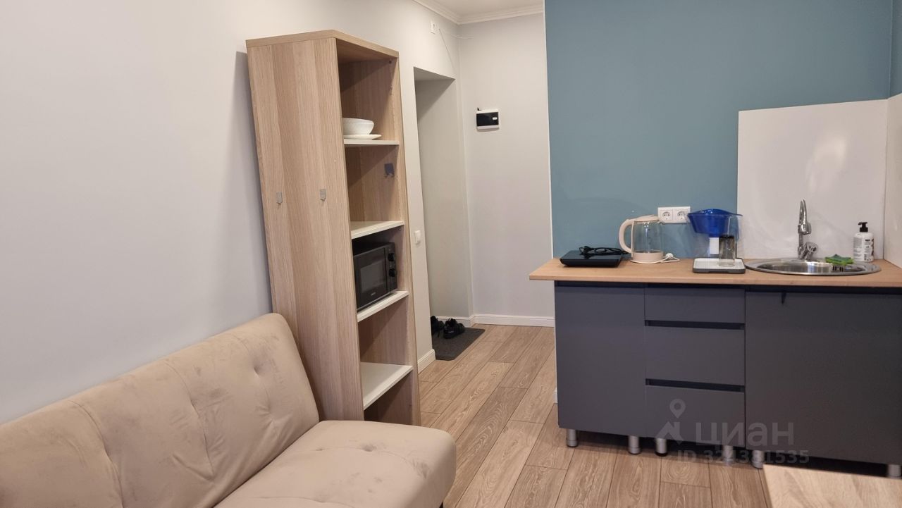Кухонный гарнитур, плитка для приготовления пищи, микроволновая печь, диван.