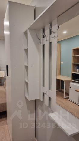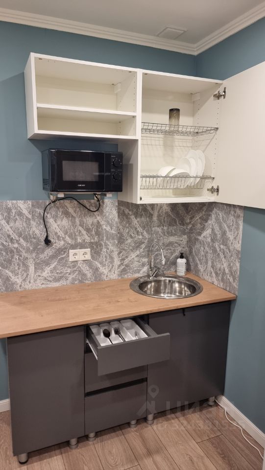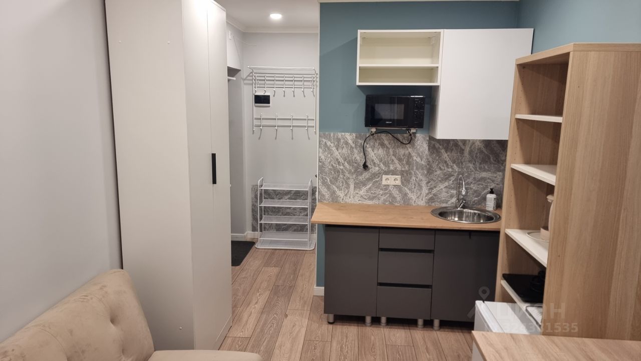 Кухонный гарнитур, плитка для приготовления пищи, микроволновая печь, чайник, диван-кровать. Мебель для хранения одежды!
