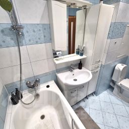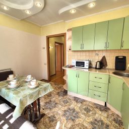 В квартире есть все необходимое для комфортного проживания до 5-6 гостей: двуспальная кровать, два раскладных дивана двуспальный и односпальный в кухне, односпальная кровать, постельные принадлежности, полотенца, тапочки. В ванной есть стиральная машина и туалетные принадлежности, фен. Работает телевизор, бесплатно Wi-fi. Утюг и гладильная доска. На кухне в наличии микроволновая печь, электрическая плитка, необходимая посуда, бокалы, чайник, вместительный холодильник. Есть мини бар