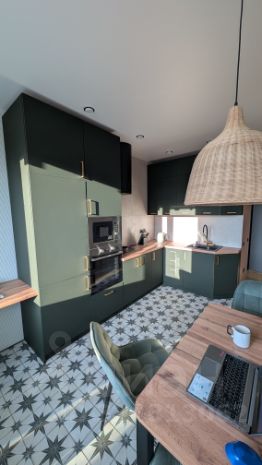 Кухня с духовой плитой, микроволновкой, кухонной плитой. фильтр для воды.