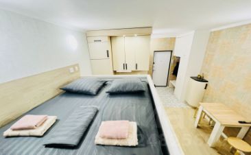 Удобства:• Чистое постельное бельё• Полотенца (банное и лицевое) — на каждого гостя• Стиральная машина, фен, утюг, Вентилятор • Просторная ванна• Стол и стулья