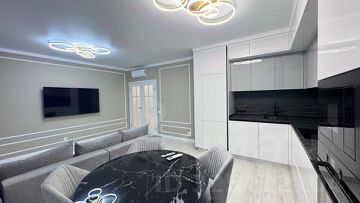 С первых минут ощущается тепло и забота — выполнен дизайнерский ремонт в мягких натуральных тонах, создающий ощущение простора и уюта. Высокие потолки (2,8 м) и полупанорамные окна наполняют комнаты естественным светом и делают атмосферу особенно тёплой к вечеру. Мебель изготовлена на заказ из качественных материалов, каждая деталь подобрана со вкусом. Французские распашные двери и белые межкомнатные полотна придают интерьеру лёгкость и элегантность.