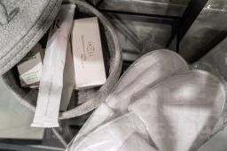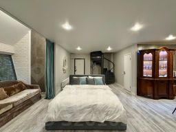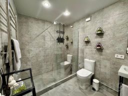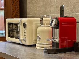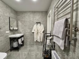 Здесь есть все для комфортного проживания: тапочки, халаты, зубной и бритвенные наборы; шампунь, кондиционер для волос и гель для душа. Мини кухня оборудована микроволновкой, чайником, капсульной кофе машиной и необходимой посудой.