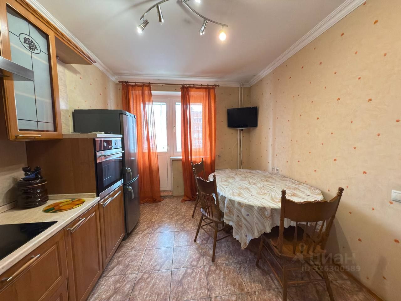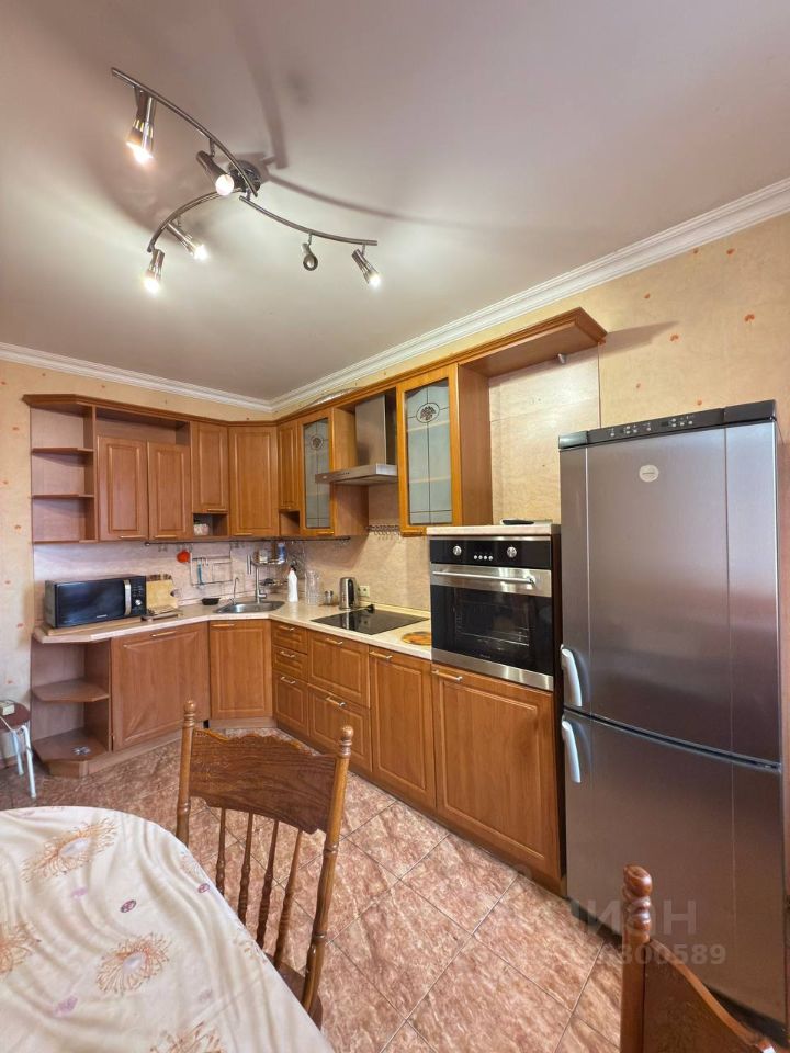 В просторной кухне - функциональное рабочее место, оснащенное современной бытовой техникой, включая духовую печь, варочную панель, посудомоечную машину под единой столешницей, вытяжку, двухкамерный холодильник, ЖК телевизор.