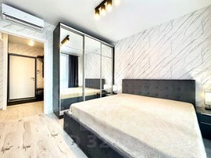 Спальная зона: двуспальная кровать с подъёмным механизмом и большой угловой зеркальный шкаф.