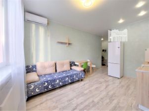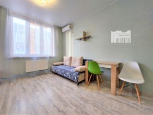 В квартире современный ремонт. Оптимальная площадь 37 кв.м. Изолированная спальня с большой кроватью и выходом на лоджию.