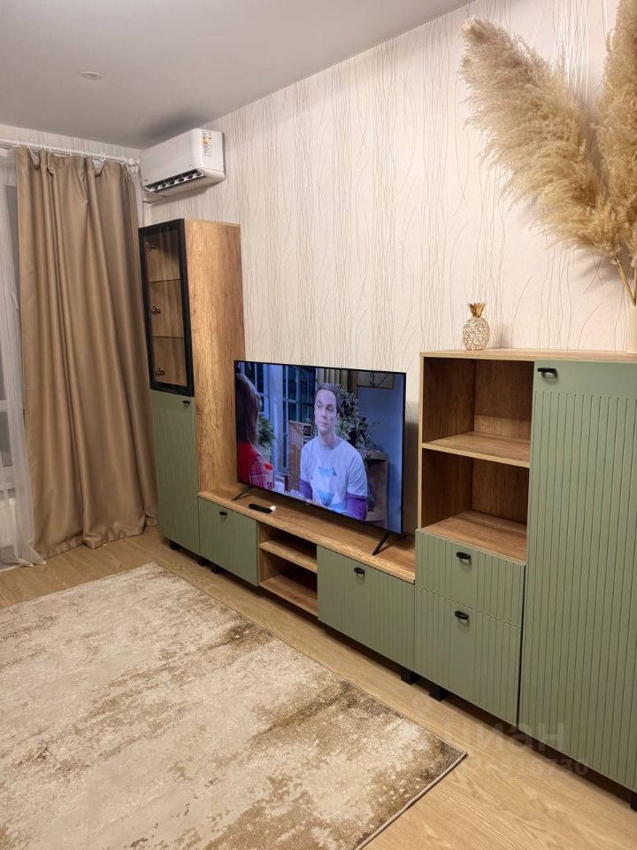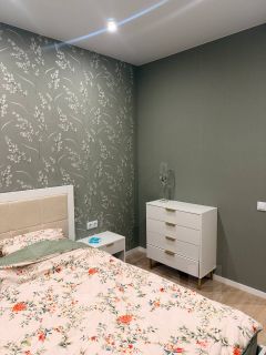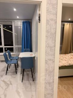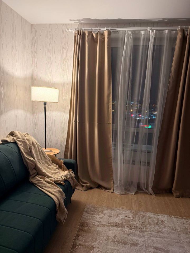 Планировка: Зонированная — одна уединённая комната с кроватью и вторая просторная комната-гостиная с диваном. Ремонт новый, квартира после ремонта не сдавалась.