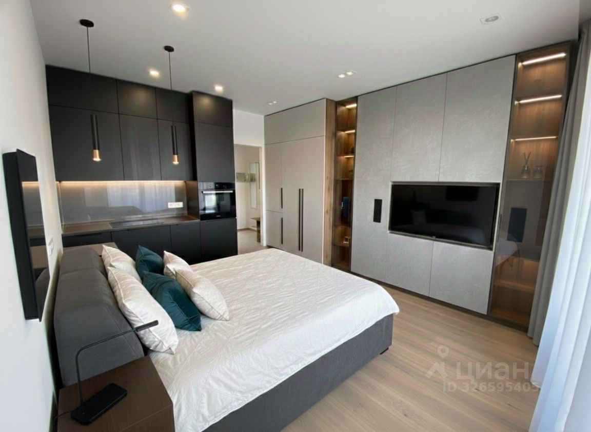 Стильная студия с премиальной атмосферой. Кухонная зона выполнена в темном цвете и полностью укомплектована: варочная панель, современная вытяжка, встроенная микроволновая печь, холодильник. Установлена система кондиционирования. Большая комфортная кровать и большой ТВ, контурные подсветки позволяют менять настроение интерьера одним кликом. Санузел в керамограните оборудован современной душевой кабиной и новой стиральной машиной.