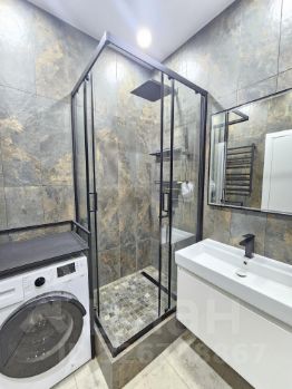 Санузел: стиральная машина, электрический полотенцесушитель, инсталляция, гигиенический душ, душевой подиум со стеклянной кабиной, проточный водонагреватель, теплые полы.