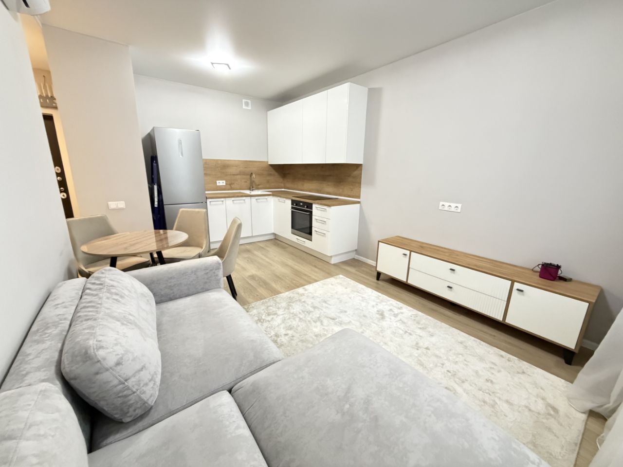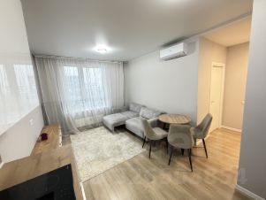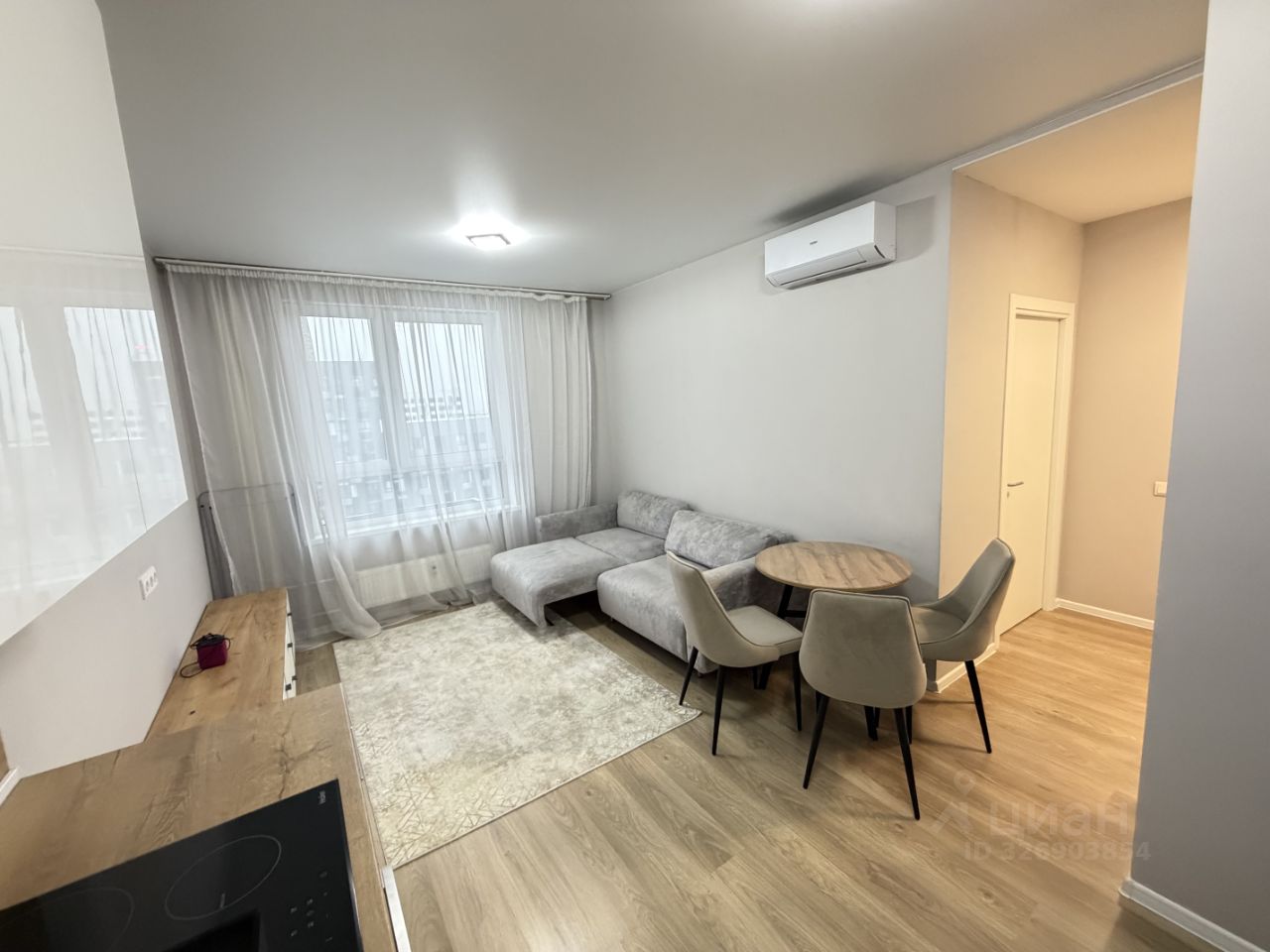 В гостиной установлен кондиционер и современный диван. Из мебели также имеются шкафы.