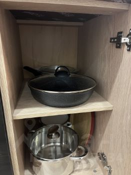 * Кухня оборудована: встроенным вместительным кухонным гарнитуром со всей необходимой бытовой техникой: электрическая варочная панель 4 конфорки, духовой шкаф, вытяжка, холодильник, чайник, фильтр для воды Гейзер Престиж Смарт. На кухне есть набор посуды, овощерезка, сковородка, посуда для запекания, кастрюли, разделочная доска, салатницы, большое кол-во разных бокалов.
