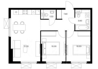 В квартире 2 спальни, 2 сан узла, кухня-гостинная.