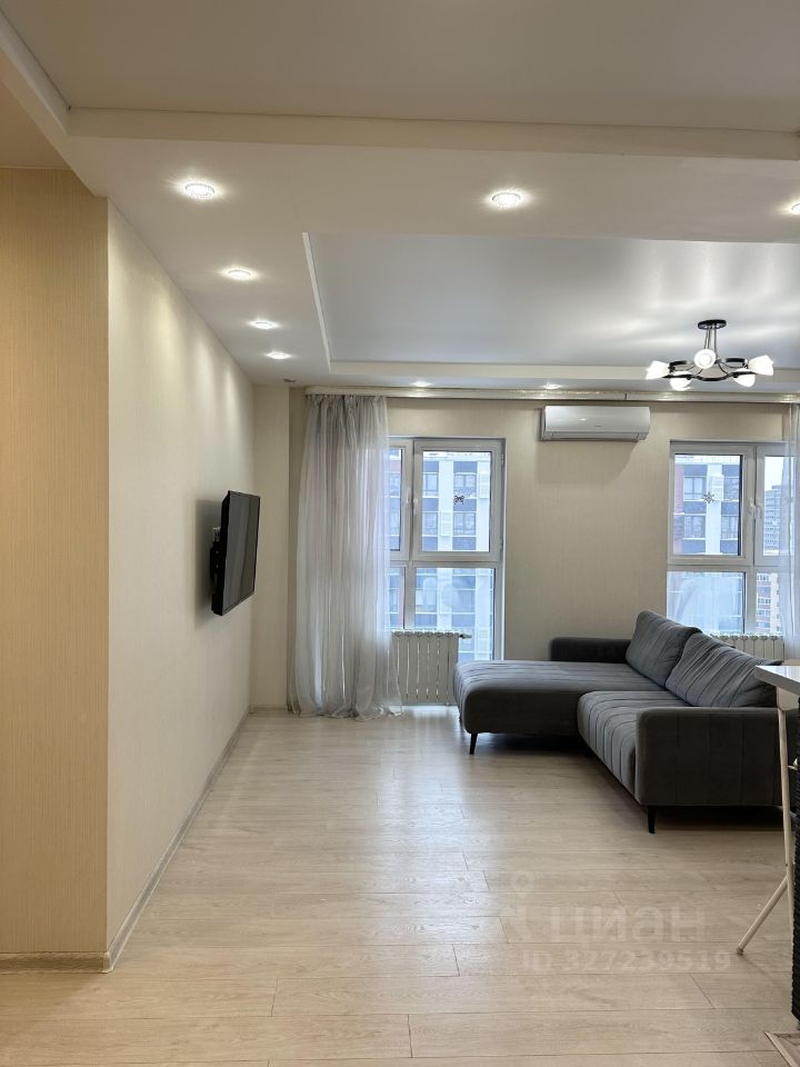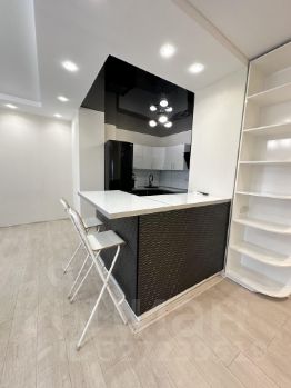 В квартире просторная кухня, оснащеная современной мебелью и техникой: холодильник, посудомоечная машина, духовой шкаф и варочная панель. Так же в квартире есть кондиционер и телевизор. Имеется лоджия, которую можно использовать как кабинет или место для отдыха.