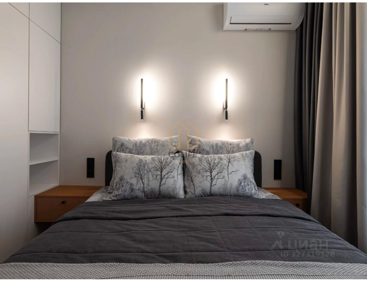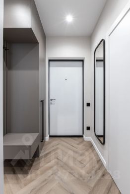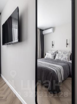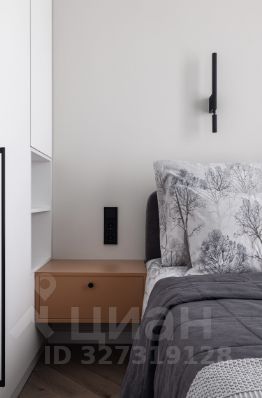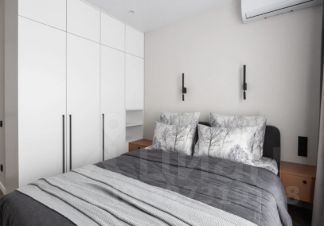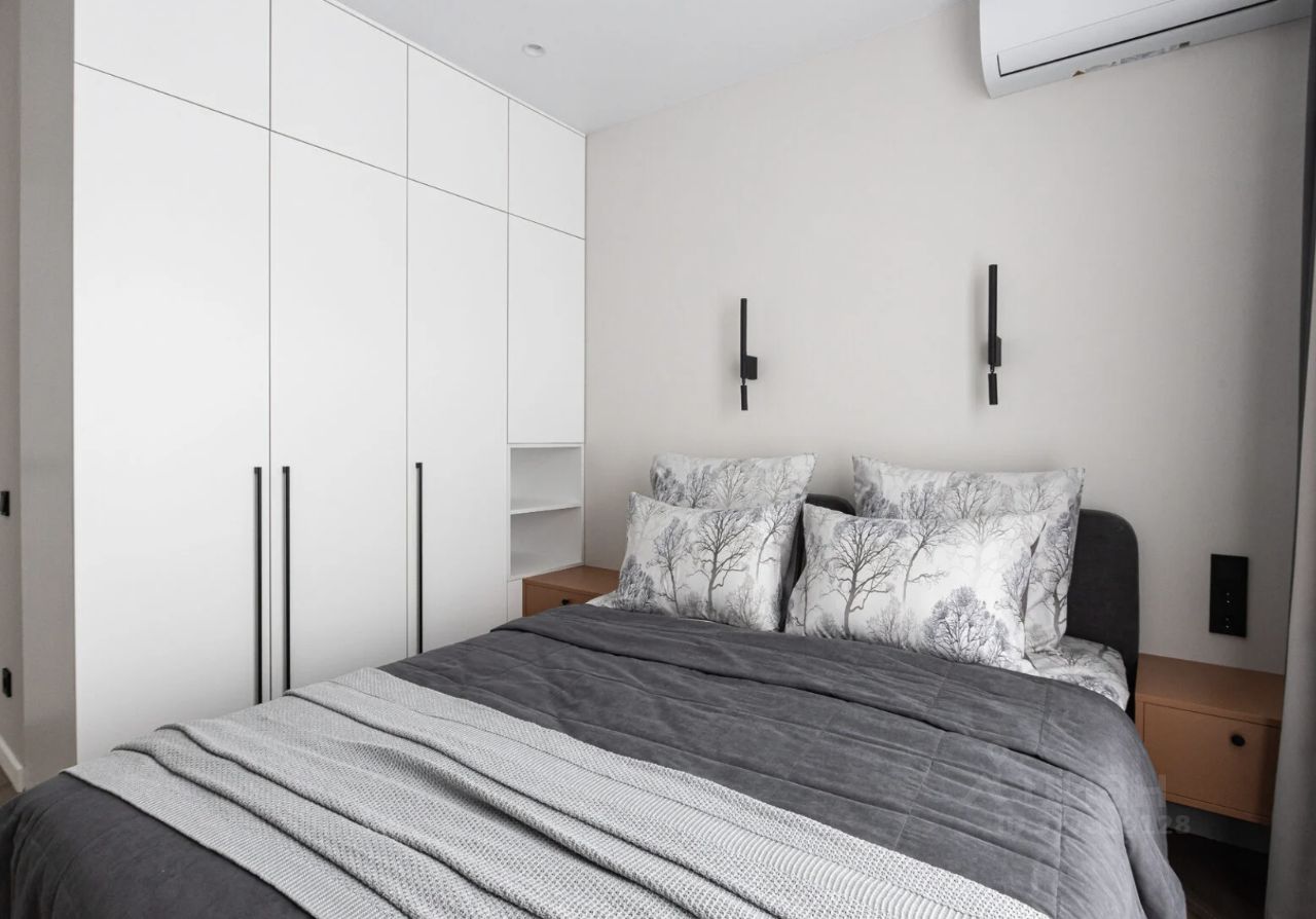 Интерьер квартиры выполнен в минималистичном стиле: пастельная палитра, аккуратные яркие акценты, плавные линии и лаконичный декор создают ощущение легкости и уюта. Пространство гармонично зонировано. В спальне — удобная кровать, вместительный шкаф, зеркало в полный рост и телевизор.
