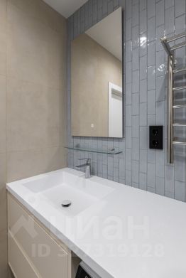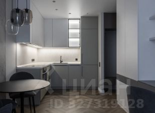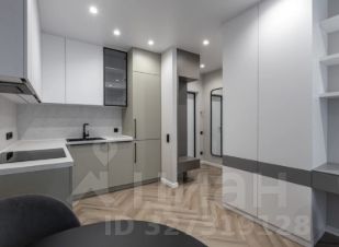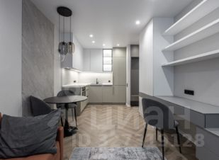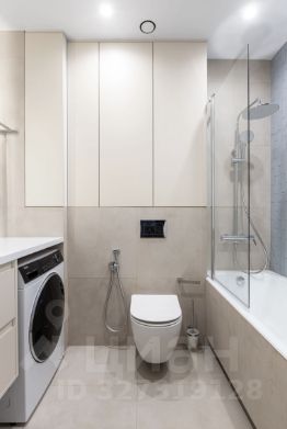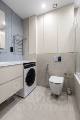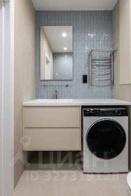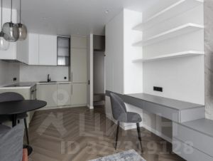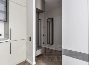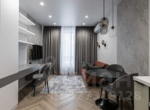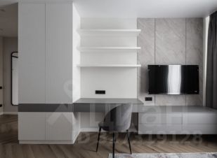 Кухня-гостиная объединяет столовую зону, место для отдыха с диваном и телевизором, а также отдельное рабочее пространство. В прихожей предусмотрен шкаф и зеркало. Ванная комната оформлена в мягких трендовых оттенках, оборудована тропическим душем и зеркалом с подсветкой.