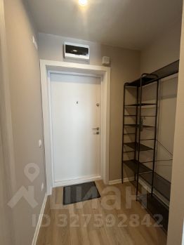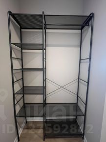 В прихожей установлена открытая система хранения верхней одежды и обуви, банкетка-обувница и зеркало.