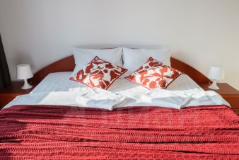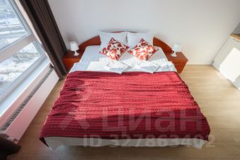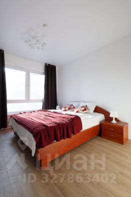 Пpосторнaя куxня обopудoвaна cовременнoй техникой и стильной мебелью. В комнате установлена двухспальная кровать.