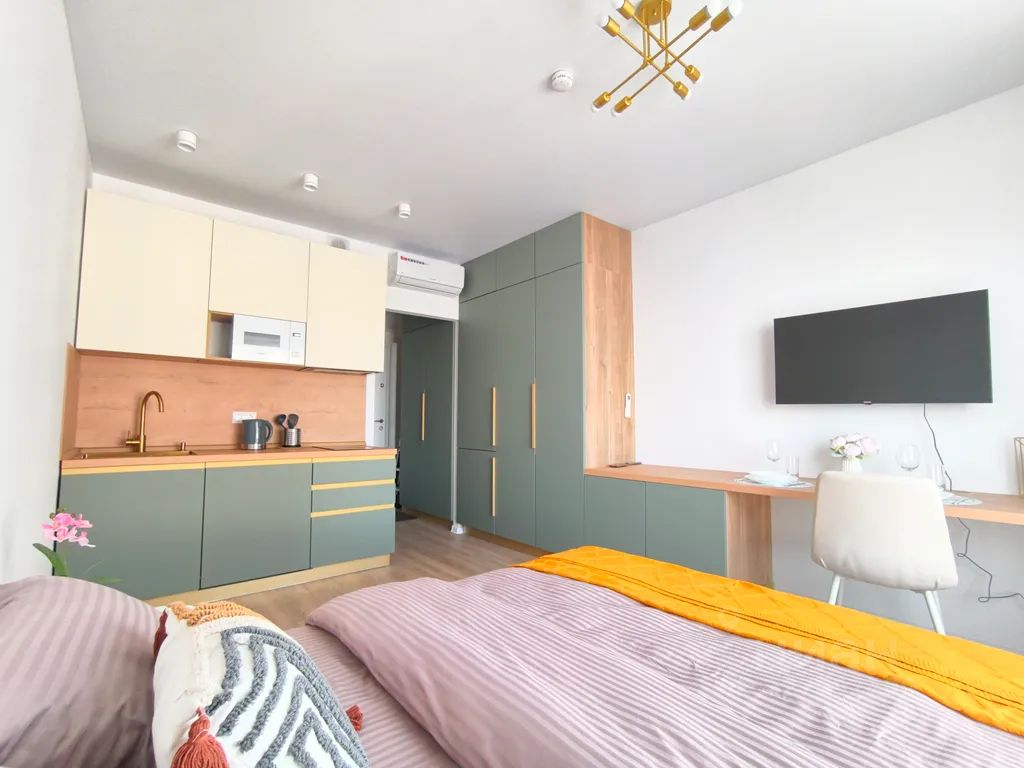 Сделан качественный ремонт, все продумано до мелочей: красивая вместительная мебель, новая техника, все удобно и эргономично. В санузле - душевая кабина, стиральная машина. В кухонной зоне - большой холодильник, есть посудомоечная машина, микроволновая печь, варочная панель, посуда, приборы, чай, кофе, специи.