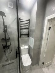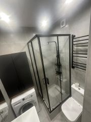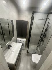 - сан. узел: стир. машина Bosch, душевая кабина с душевой системой, подвесная тумба с раковиной, зеркальный шкафчик над раковиной, инсталляция.