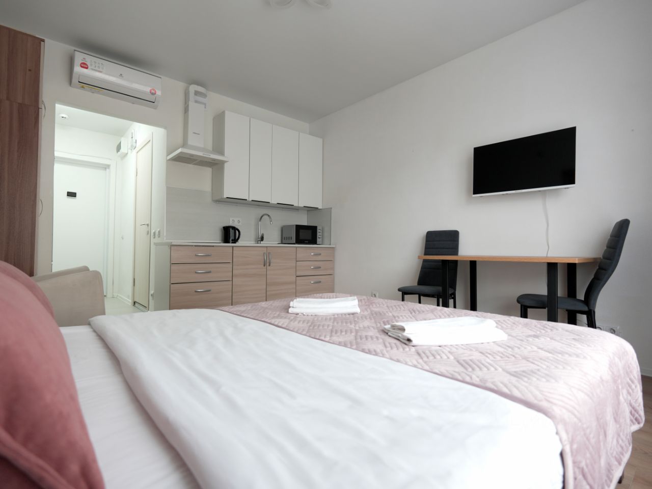 Полностью оборудованная кухня: электрическая плита, микроволновка, холодильник, электрочайник, вся посуда и столовые приборы;