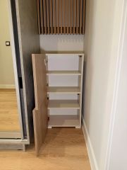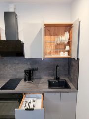 Новая мебель: раскладываемый диван, ТВ-тумба, шкаф-купе, вешалка с тумбочкой, стол, стулья, новая кухня.