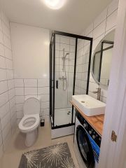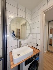 Ванная комната: зеркало, новая раковина, полочный шкафчик, новый унитаз, новая душевая кабина.