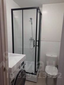 В санузле: душевая кабина, стиральная машина установлена под раковиной и сбоку удобный шкафчик для химии и/или средств личной гигиены, электрический полотенцесушитель, зеркало с подсветкой.