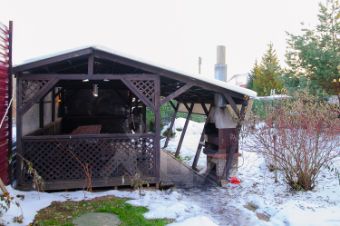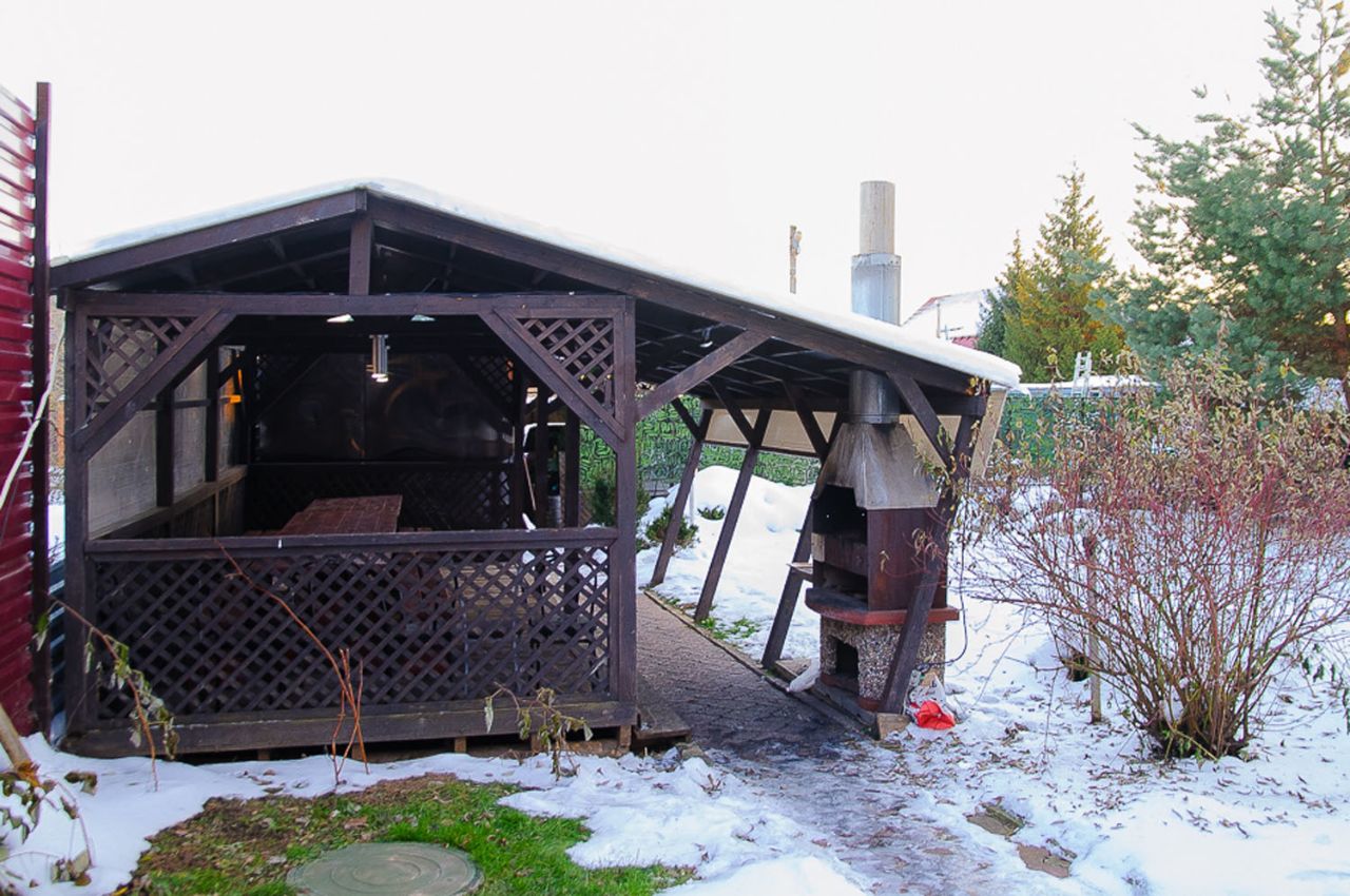 На участке 15 соток: деревянная садовая мебель, зонты, мангал, барбекю, туи. Открытая автостоянка на 10 автомобилей.