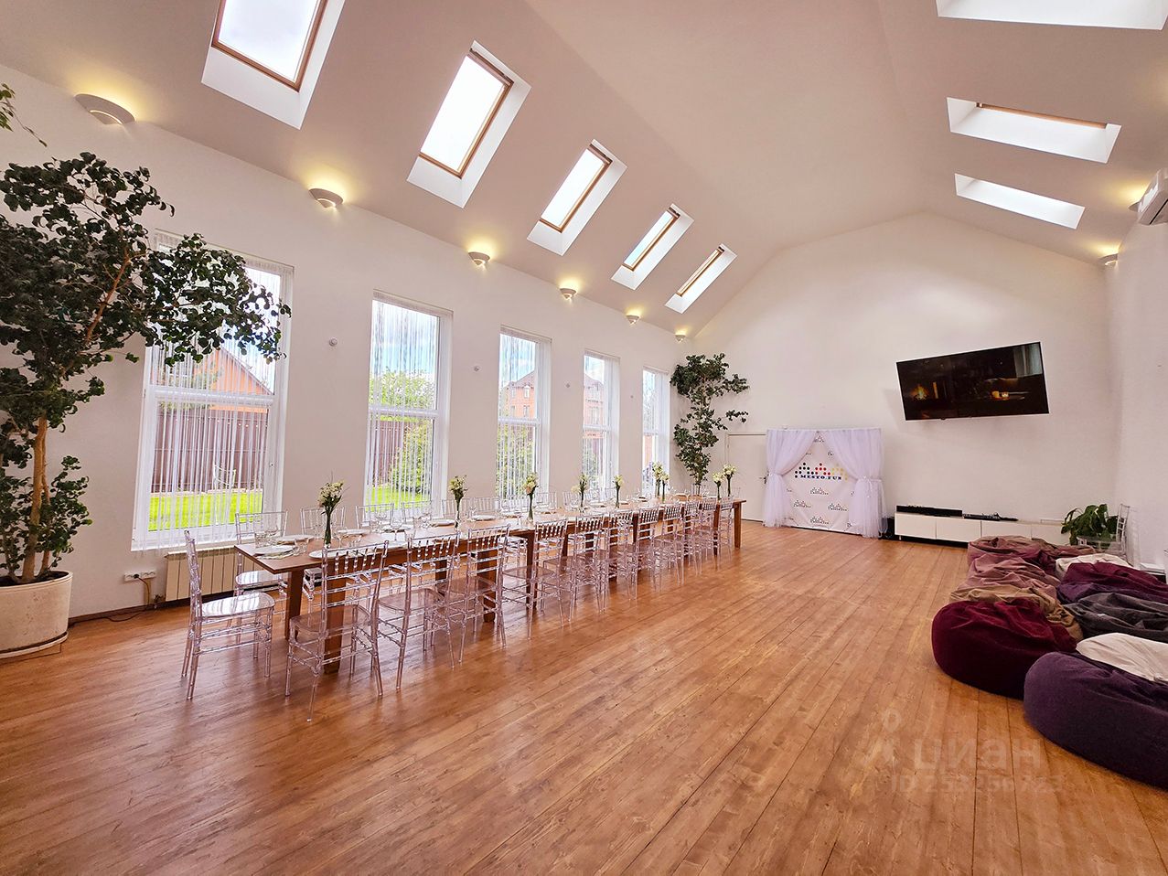 - Большой светлый банкетный зал общей площадью 100 кв м с панорамными и мансардными окнами, высота потолка 6 метров