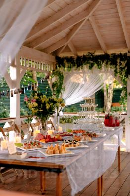 - Питание на высшем уровне, выездной кейтеринг, официанты, повара, оформление зала и беседки, банкетная посуда (по запросу)