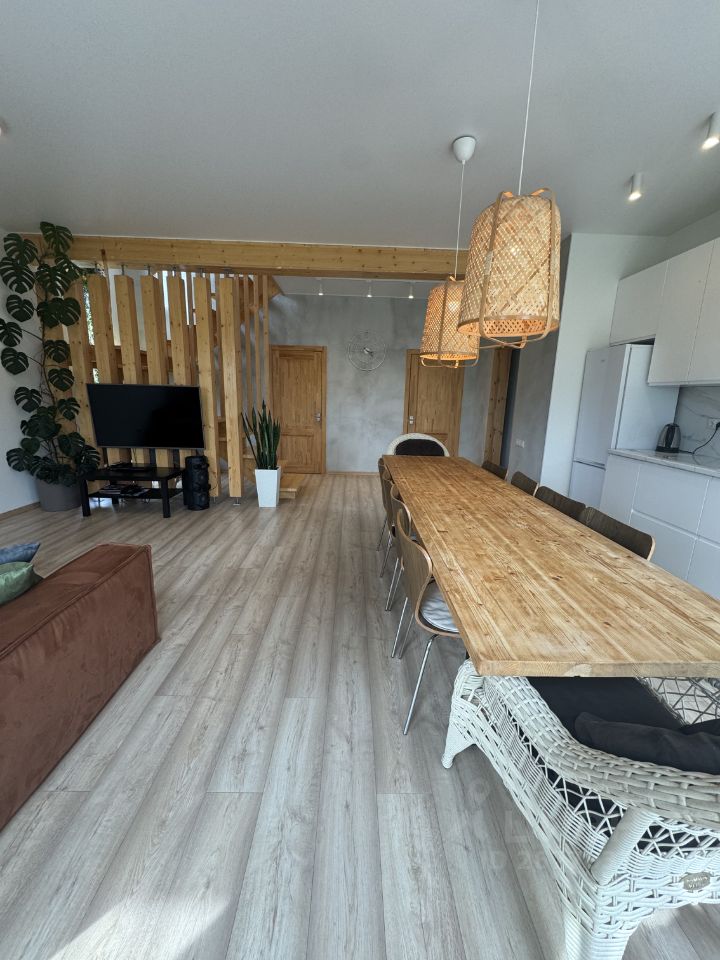 В доме 2 этажа, 4 спальни и 3 санузла, в гостиной раскладывающийся диван, как дополнительное спальное место, спальное место в сауне.