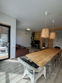 На террасе отличное место для посиделок с двухметровым столом и шикарным видом на воду.