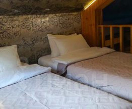 В основном помещении кровать-подиум 200х200, чилл-зона,в мансарде два матраса 100х200(можно сдвинуть), туалетная и ванная комнаты, душевая, сауна(есть режим русской бани)