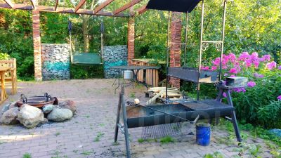 На участке есть костровая площадка с оборудованным местом для костра, металлический мангал с крышей, каменный мангал , есть настоящий казан , тренога для ухи на большую компанию, вертел для жарки целого барана, большая застекленная беседка с дубовым столом на 15 человек, для отдыха есть велосипеды, лодка для рыбалки, байдарки,