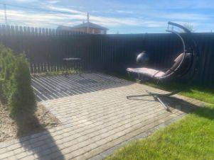 На придомовой территории посажены туи и изумрудный газон с автополивом, оборудована шашлычная зона и размещен небольшой ангар для хранения велосипедов и других вещей.