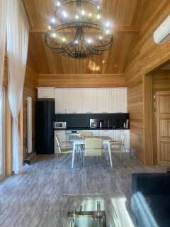 Дом внутри и терраса отделаны лиственницей. В доме расположены: кухня-гостиная с двойным светом, 2 спальни (16,8 кв м и 10,3 кв м), холл, санузел с душевой кабиной и техническое помещение (бойлерная). Из кухни-гостиной выход на просторную крытую террасу, площадью 19,7 кв. м.