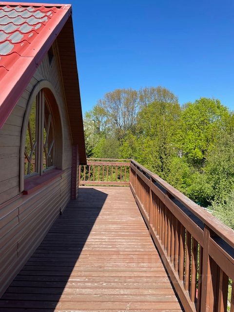 на 2 этаже дома основная кухня 10 кв.м, санузел,столовая, гостиная с камином и балкон с панорамным видом на участок и речку.