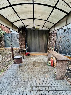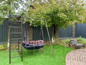 Территория усажена хвойными и плодовыми деревьями, кустарниками, цветами и газоном. Участок освещается и вымощен брусчаткой. На территории большая стоянка, мангальная зона, детская площадка, в планах корт для активных игр. На задней лужайке есть возможность поставить бассейн. Вода фильтрованная со скважены, регулируемое газовое отопление.
