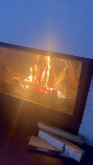 гостиная-трансформер 60 м² оснащенная мебелью и большим столом на 10 - 15 человек, с дровяным камином, панорамными окнами и домашним кинотеатром.
